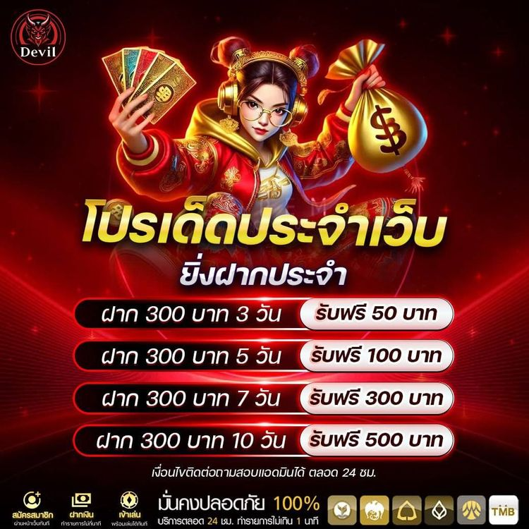 ที่สำคัญ การฝากถอนเงินทำได้ง่ายผ่านระบบอัตโนมัติตลอด 24 ชั่วโมง ไม่มีขั้นต่ำในการฝาก และถอนได้ไม่จำกัดจำนวนครั้ง หากมีข้อสงสัยหรือต้องการความช่วยเหลือ ทีมงานพร้อมให้บริการตลอด 24 ชั่วโมงผ่านช่องทาง Live Chat หรือ Line Official Account อย่ารอช้า! มาร่วมสนุกและลุ้นรับรางวัลใหญ่กับ DEVILX กันเถอะ รับรองว่าคุณจะได้รับประสบการณ์การเดิมพันออนไลน์ที่คุ้มค่าและน่าประทับใจอย่างแน่นอน